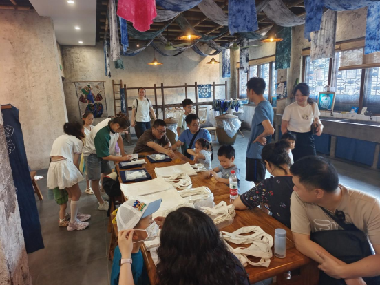 实践环节将活动推向高潮。在导师指导下,家长与孩子共同设计图案一方白巾经绳结扎缚、浸染定色,逐渐幻化出星辰、海浪等创意纹样。孩子不仅学会了扎染技法,更在协作中理解了‘匠心’的深意。现场欢声笑语交织,蓝白相间的作品铺展成独特风景。