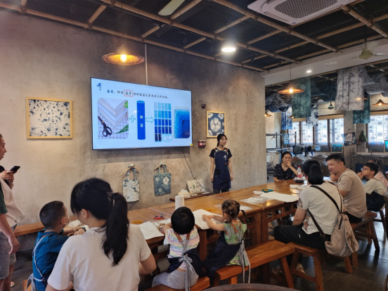 体验馆导师为孩子们开启扎染文化之旅。通过实物展示与趣味动画,生动讲解扎染千年历史与绞缬、夹缬等传统工艺,让孩子们在“布里生花”的故事中感受古人智慧。