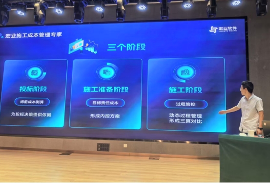 许明明老师为参会人员展示了“宏业自主算量平台”,通过BIM技术动态模拟成本控制流程,并展示智能调价模型、云端协同算量等功能,直观呈现数智化工具在工程造价管理中的降本增效潜力。